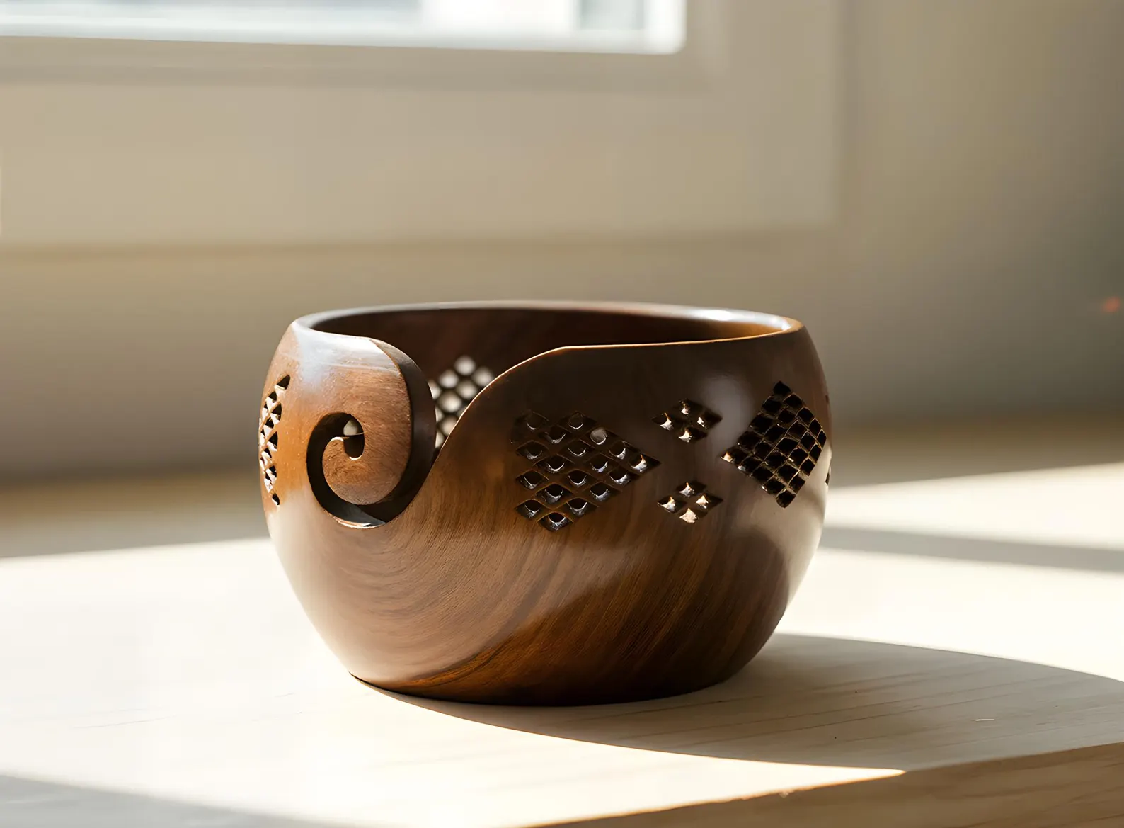 Handcrafted rosewood Wooden Yarn Bowl: Laser-Cut Floral Design, Knitting and Crochet